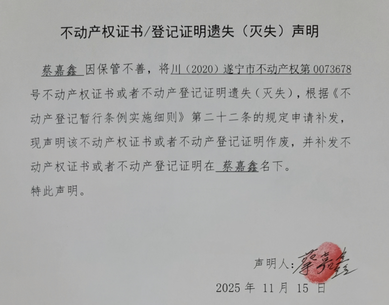 不动产权证书/登记证明遗失(灭失)声明(蔡嘉鑫)