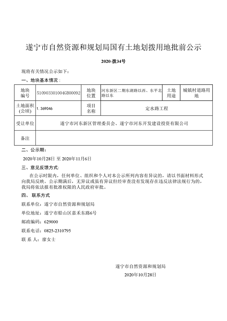 遂宁市自然资源和规划局国有土地划拨用地批前公示2020-拨34号