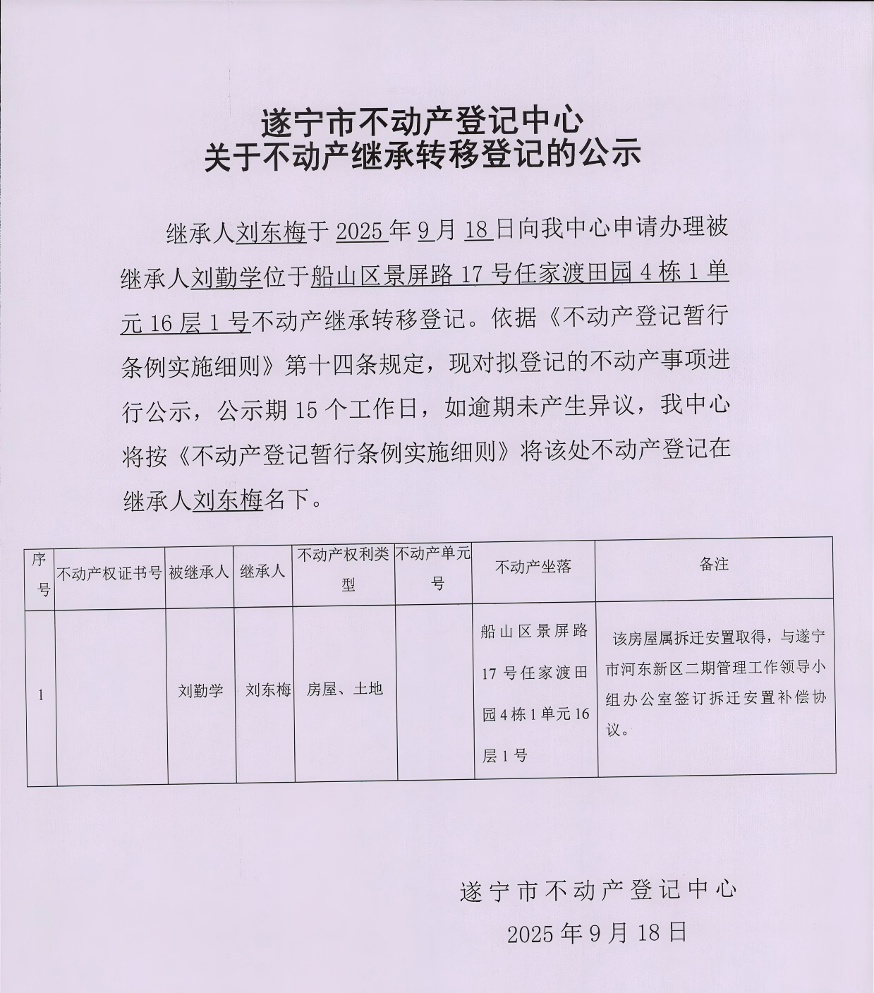 遂宁市不动产登记中心关于不动产继承转移登记的公示(刘东梅)
