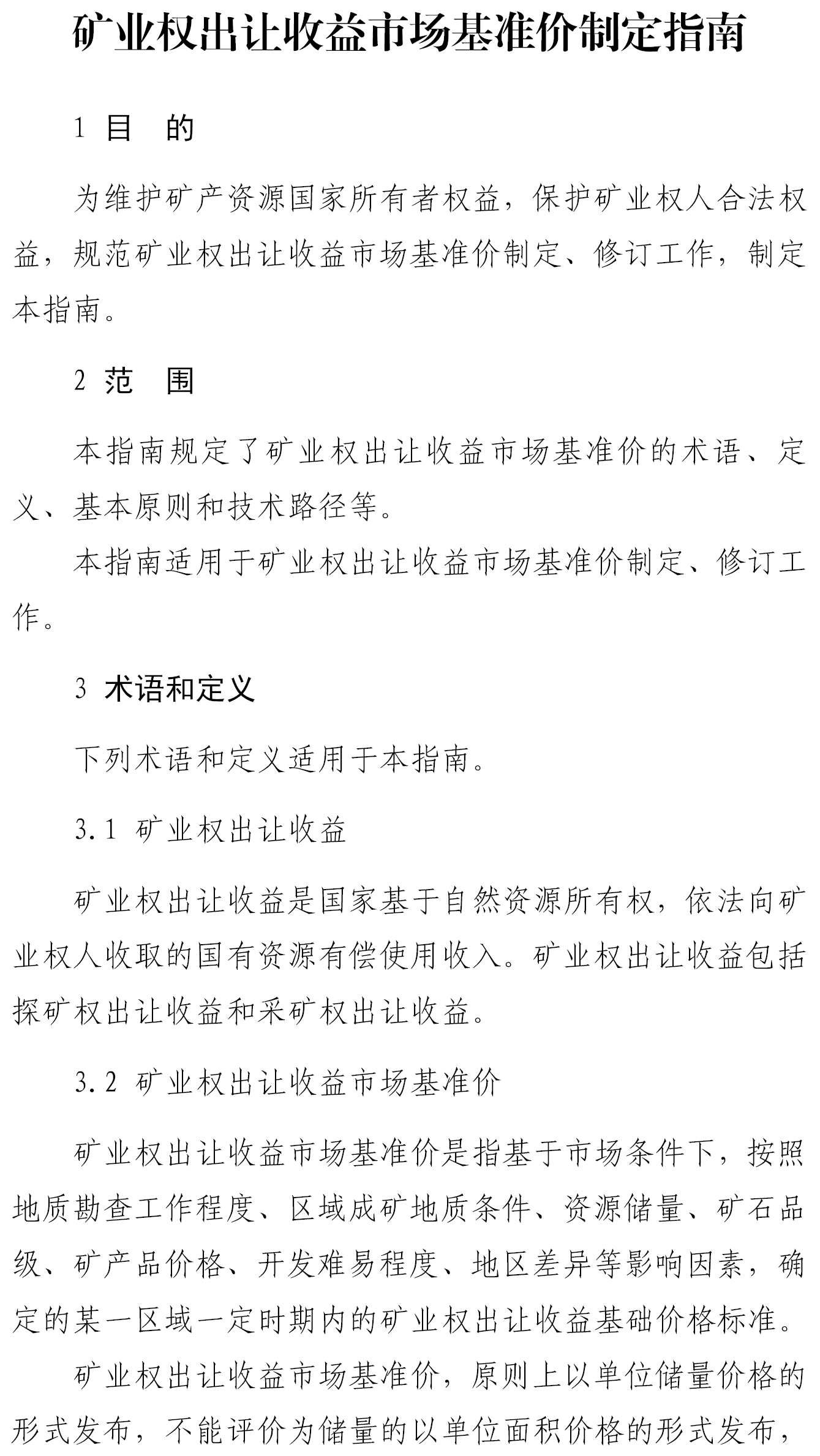 《指南》规定了矿业权出让收益市场基准价的术语、定义、基本原则和技术路径等;适用于矿业权出让收益市场基准价制定、修订工作。