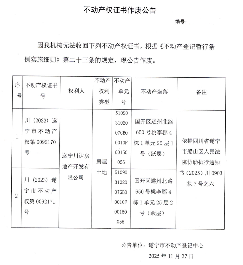 不动产权证书作废公告(遂宁川达房地产开发有限公司)