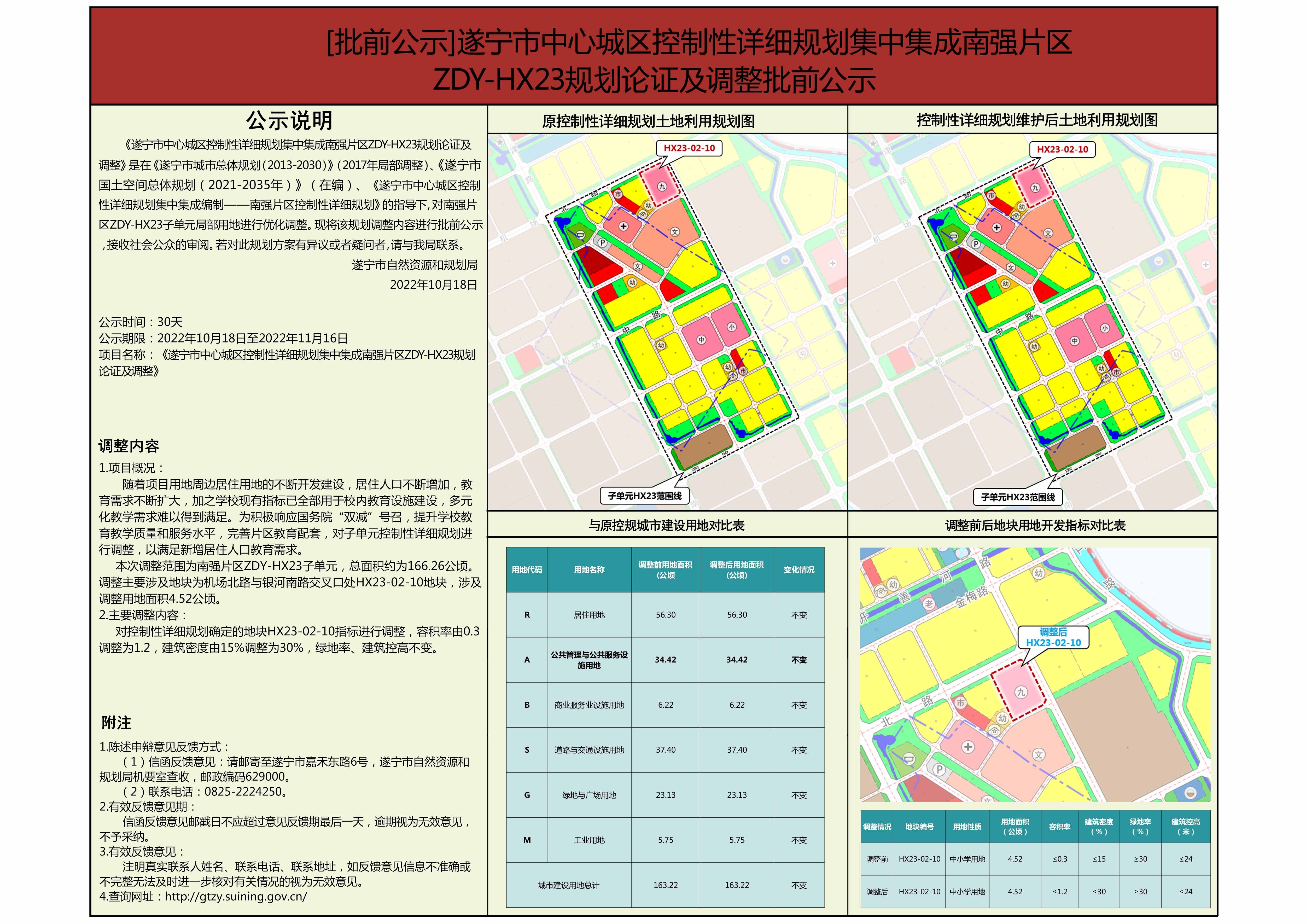《遂宁市中心城区控制性详细规划集中集成南强片区ZDY-HX23规划论证及调整》是在《遂宁市城市总体规划(2013-2030)》(2017年局部调整)、《遂宁市国土空间总体规划(2021-2035年)》(在编)、《遂宁市中心城区控制性详细规划集中集成编制——南强片区控制性详细规划》的指导下,对南强片区ZDY-HX23子单元局部用地进行优化调整。现将该规划调整内容进行批前公示,接收社会公众的审阅。若对此规划方案有异议或者疑问者,请与我局联系。