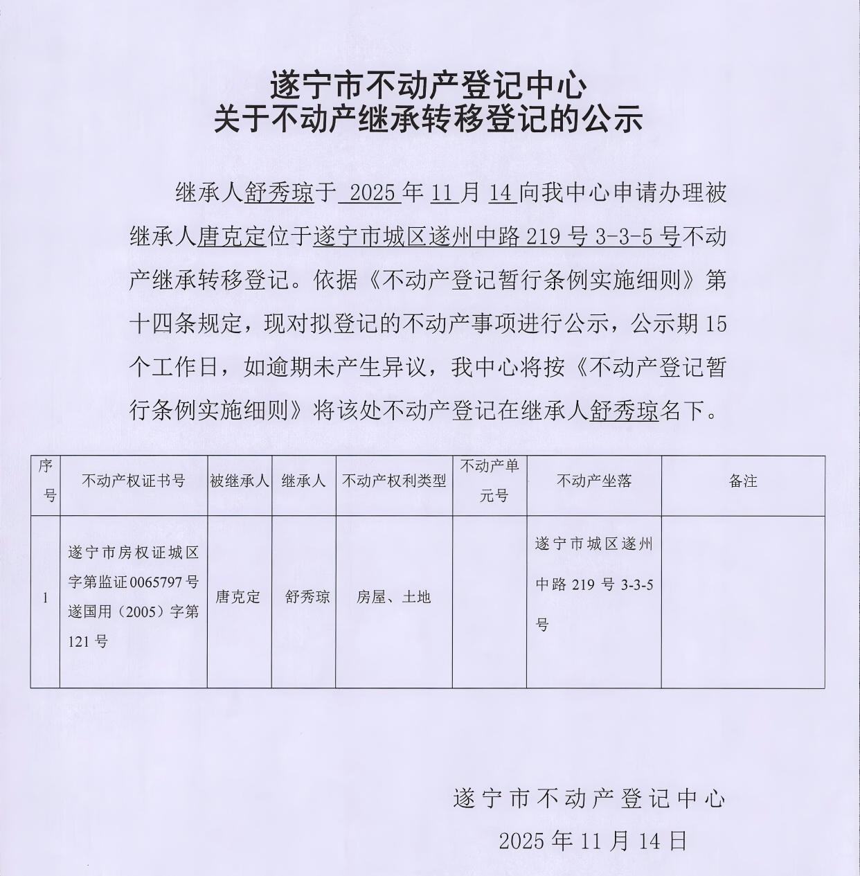 遂宁市不动产登记中心关于不动产继承转移登记的公示(舒秀琼)