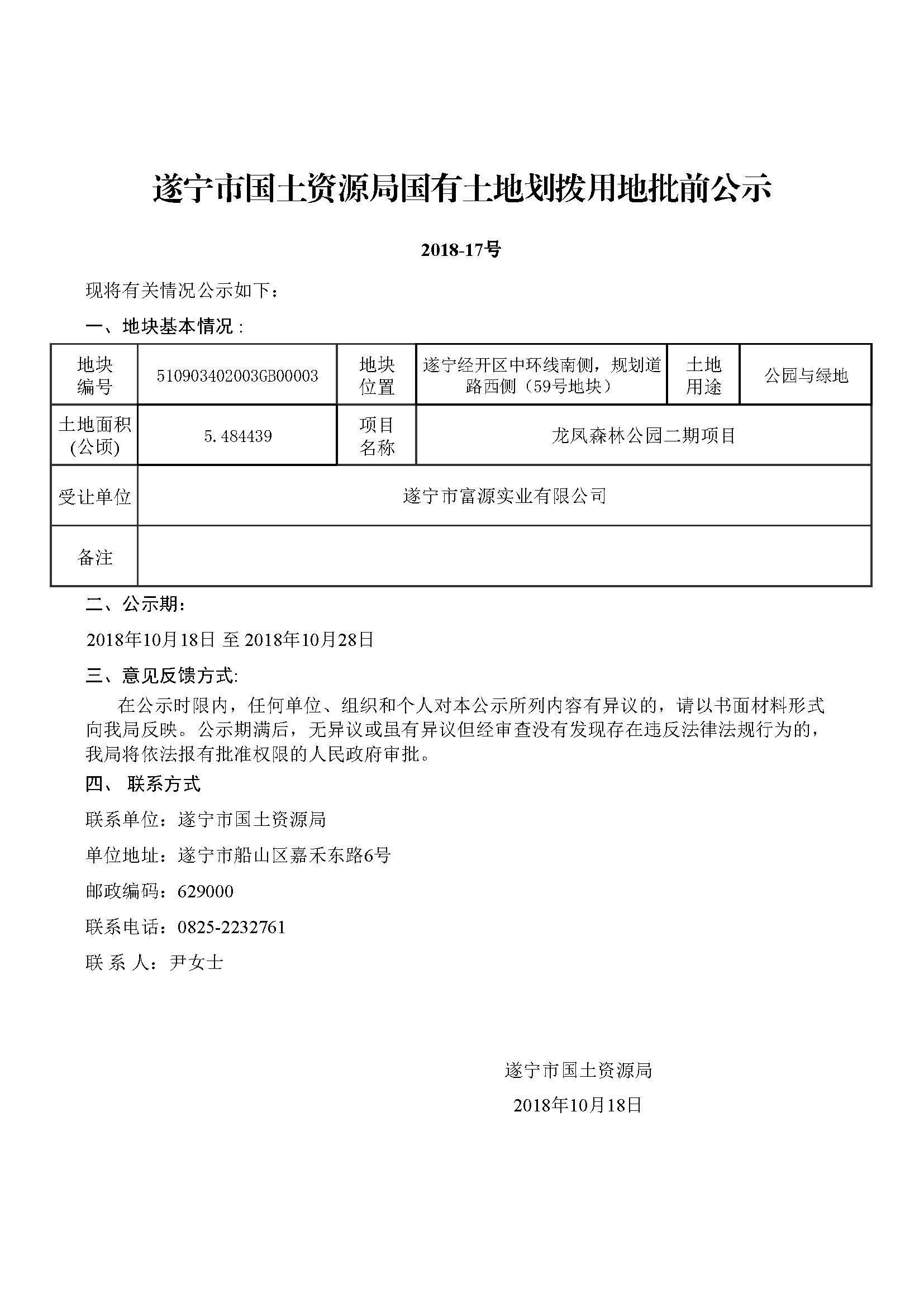 遂宁市国土资源局国有土地划拨用地批前公示(2018-17号)