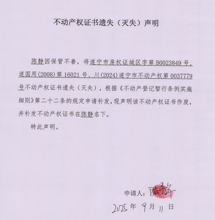 不动产权证书遗失(灭失)声明(陈静)