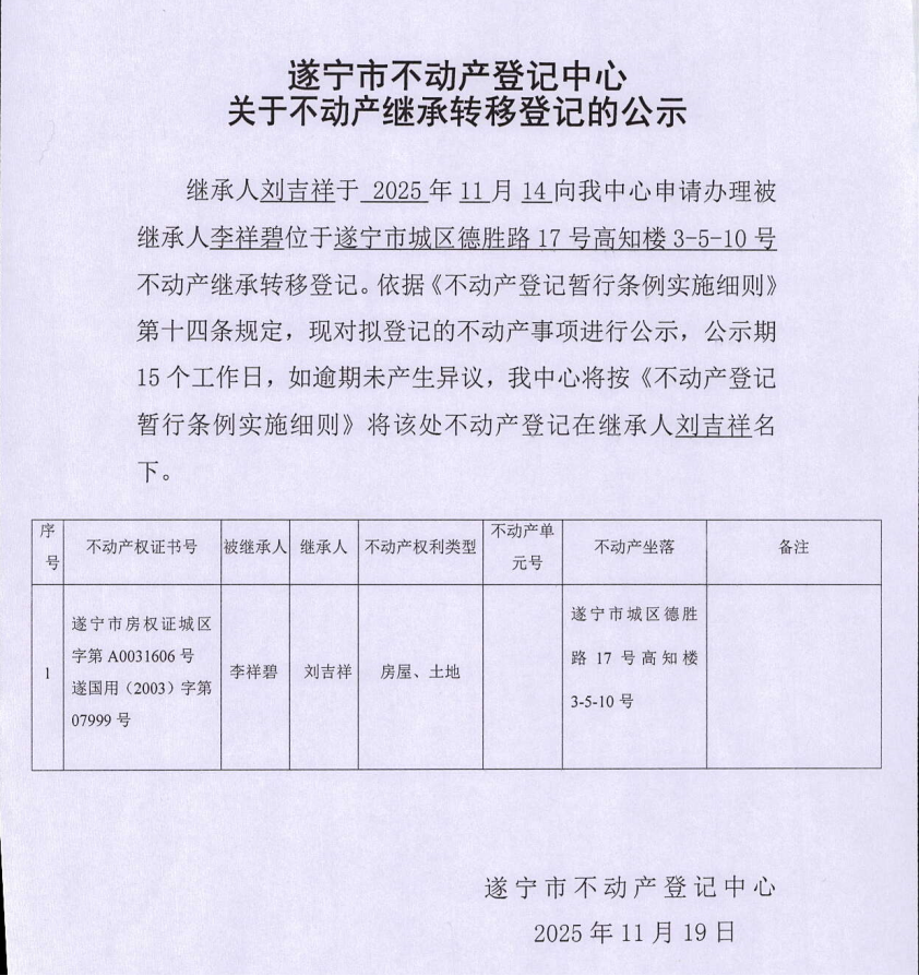 遂宁市不动产登记中心关于不动产继承转移登记的公示(刘吉祥)
