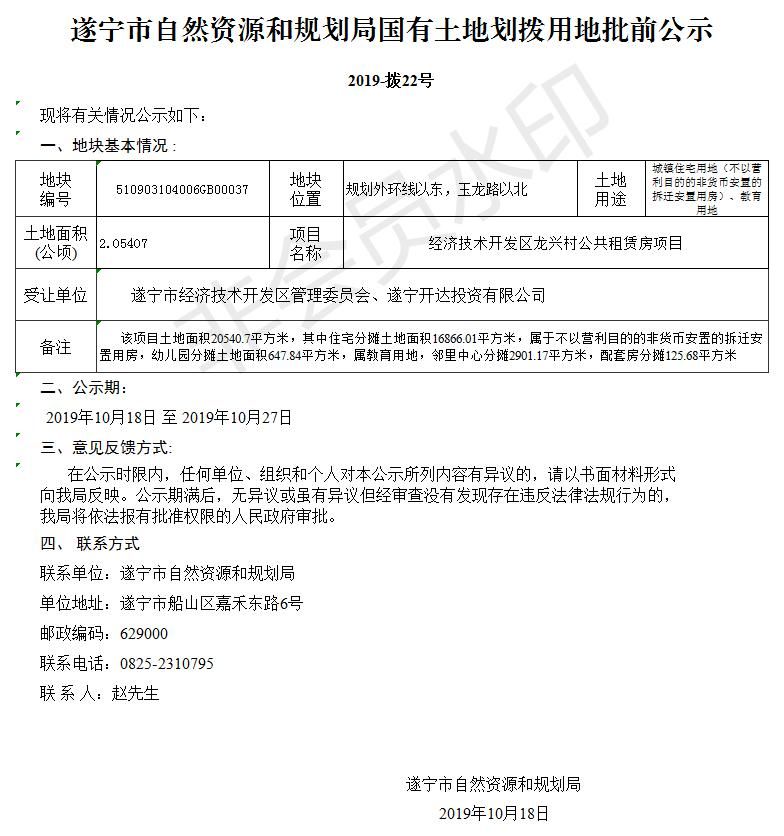 遂宁市自然资源和规划局国有土地划拨用地批前公示(2019-拨22号)