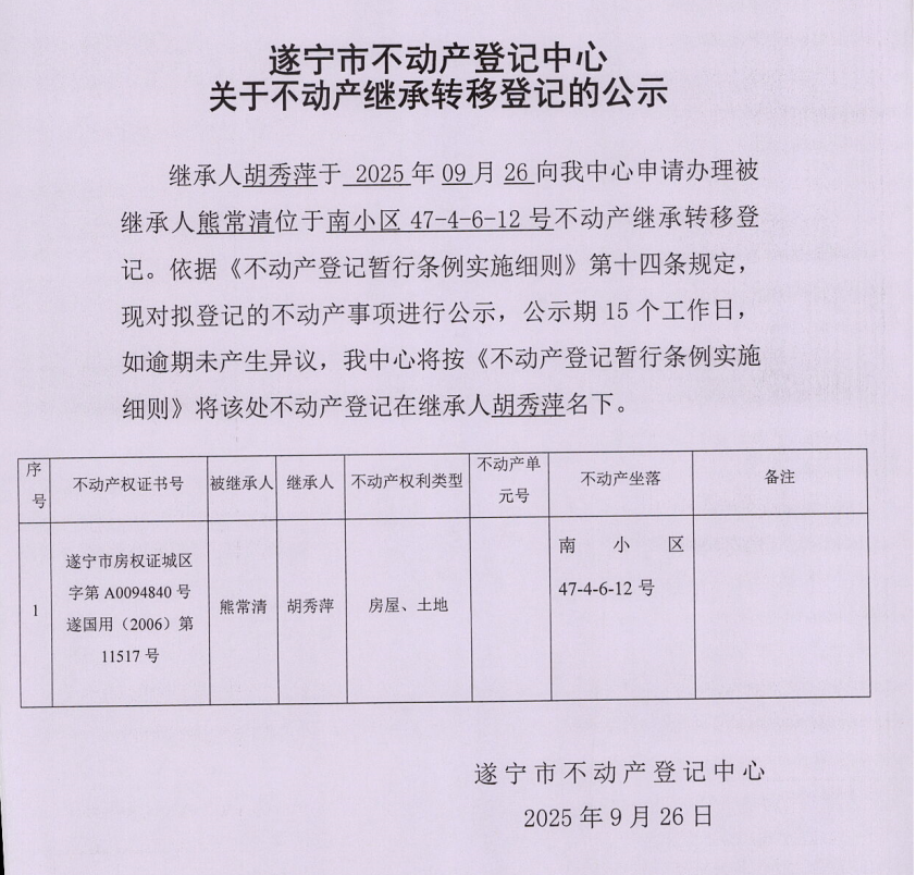 遂宁市不动产登记中心关于不动产继承转移登记的公示(胡秀萍)