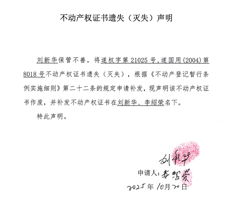 不动产权证书遗失(灭失)声明(刘新华、李绍荣)