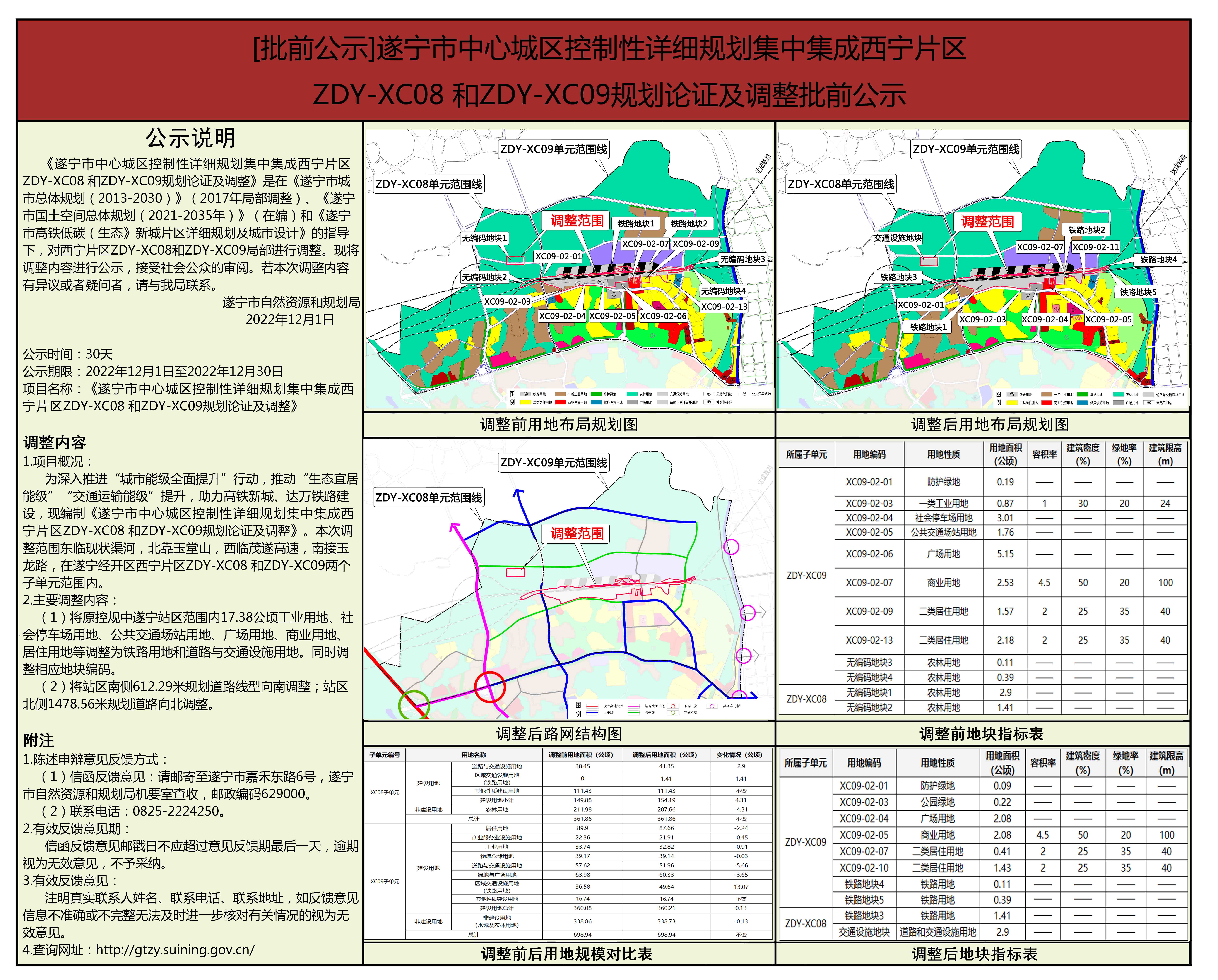 《遂宁市中心城区控制性详细规划集中集成西宁片区ZDY-XC08 和ZDY-XC09规划论证及调整》是在《遂宁市城市总体规划(2013-2030)》(2017年局部调整)、《遂宁市国土空间总体规划(2021-2035年)》(在编)和《遂宁市高铁低碳(生态》新城片区详细规划及城市设计》的指导下,对西宁片区ZDY-XC08和ZDY-XC09局部进行调整。现将调整内容进行公示,接受社会公众的审阅。若本次调整内容有异议或者疑问者,请与我局联系。