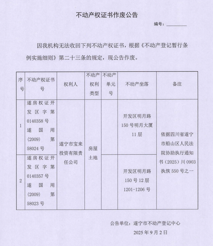 不动产权证书作废公告(遂宁市宝来投资有限责任公司)