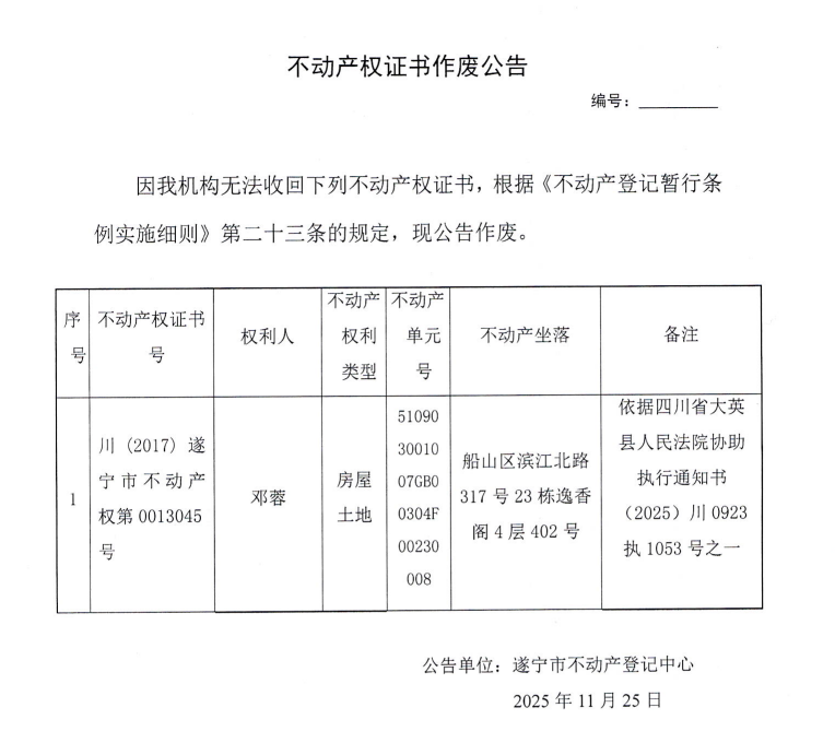 不动产权证书作废公告(邓蓉)