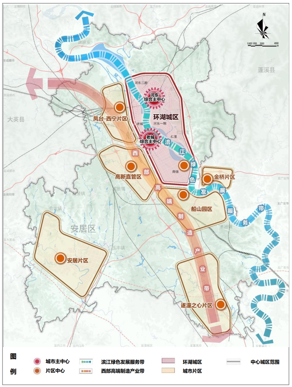四是引导产业功能聚集。集中在遂宁经开区南强片区、遂宁高新区南片区、船山区循环产业园区、安居区经开区、遂潼之心片区作为产业拓展空间;引导商务、金融等楼宇经济向河东永盛湖中央活力区集聚,产业类服务中心平台向南强核心区集聚,打造环湖城市品质展示的核心功能区。