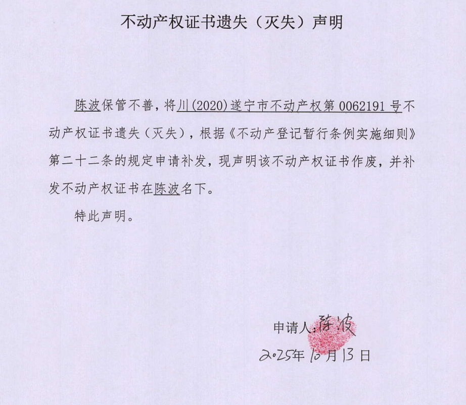 不动产权证书遗失(灭失)声明(陈波)
