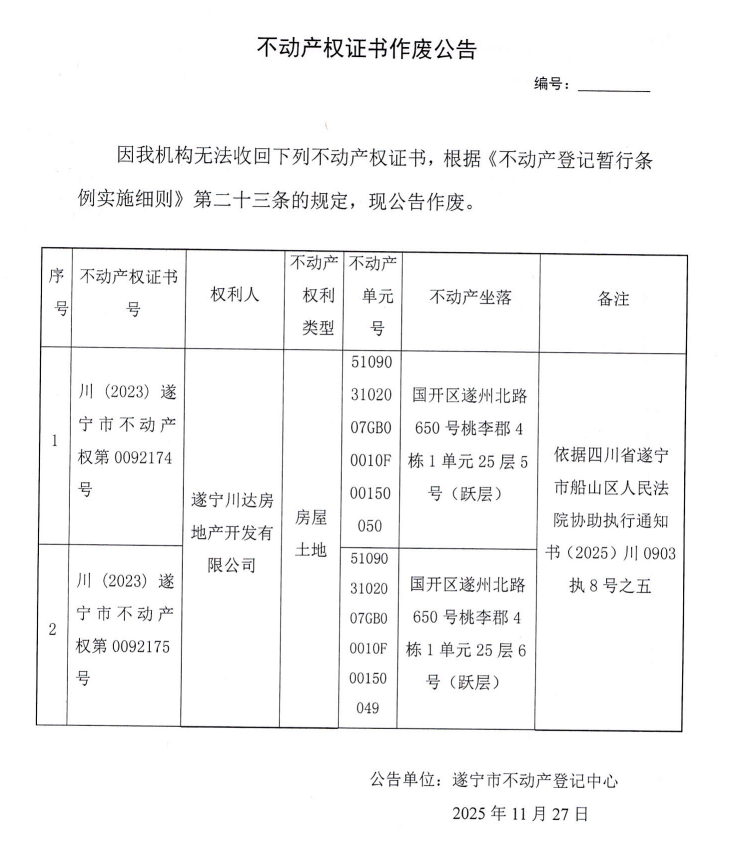 不动产权证书作废公告(遂宁川达房地产开发有限公司)