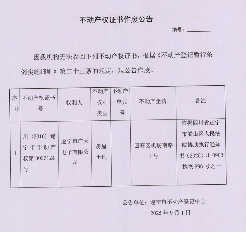 不动产权证书作废公告(遂宁市广天电子有限公司)