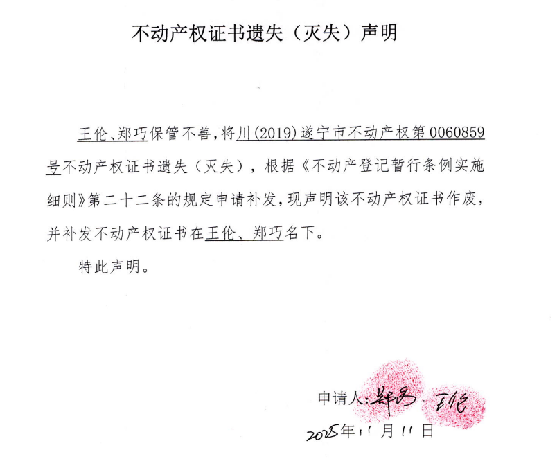 不动产权证书遗失(灭失)声明(王伦、郑巧)