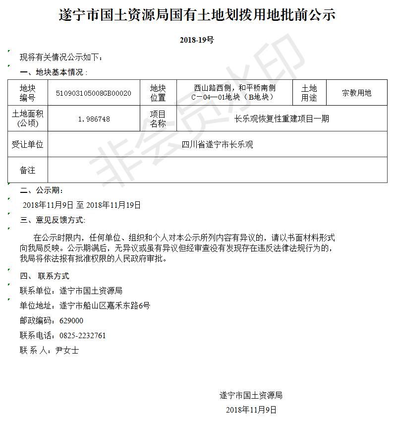 遂宁市国土资源局国有土地划拨用地批前公示(2018-19号)