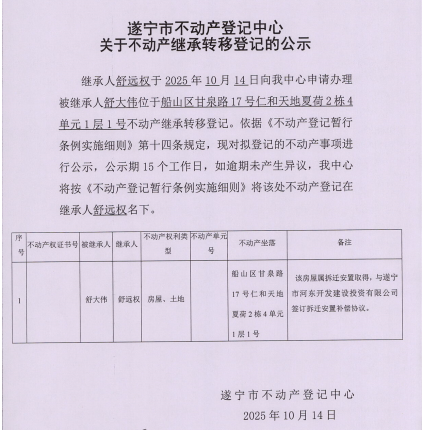遂宁市不动产登记中心关于不动产继承转移登记的公示(舒远权)