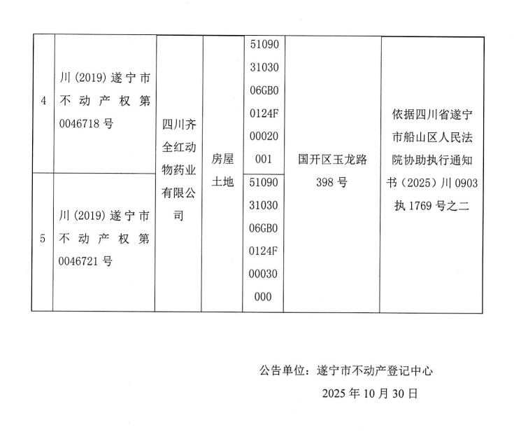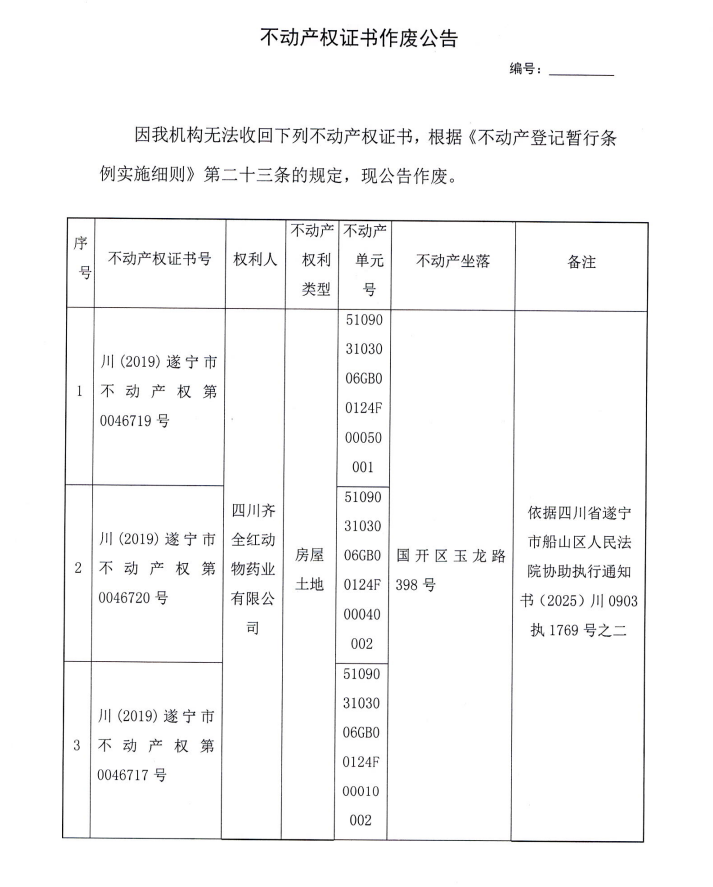 不动产权证书作废公告(四川齐全红动物药业有限公司)