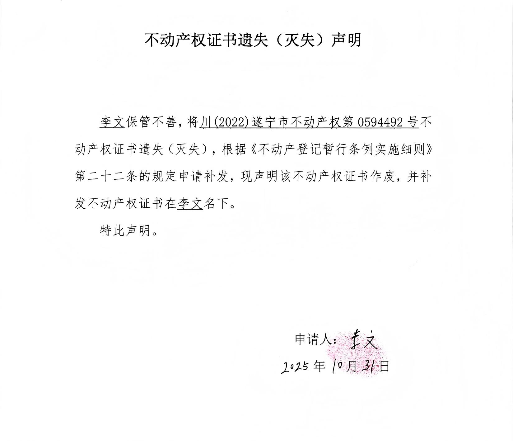 不动产权证书遗失(灭失)声明(李文)