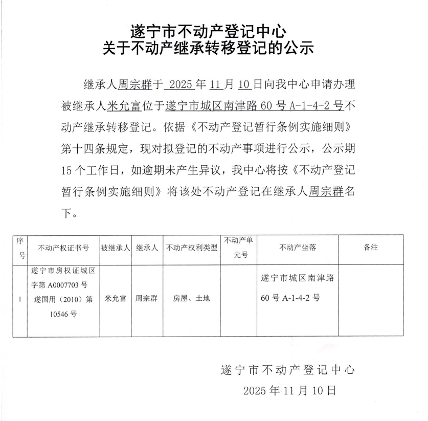 遂宁市不动产登记中心关于不动产继承转移登记的公示(周宗群)