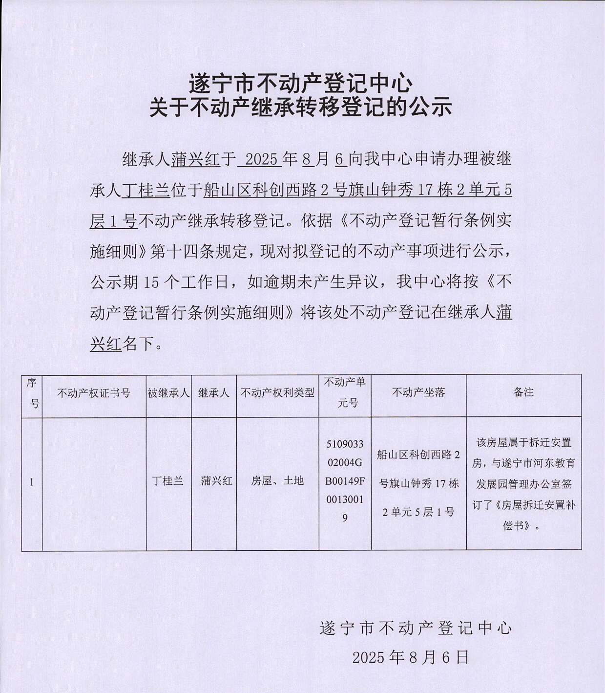 遂宁市不动产登记中心关于不动产继承转移登记的公示(蒲兴红)