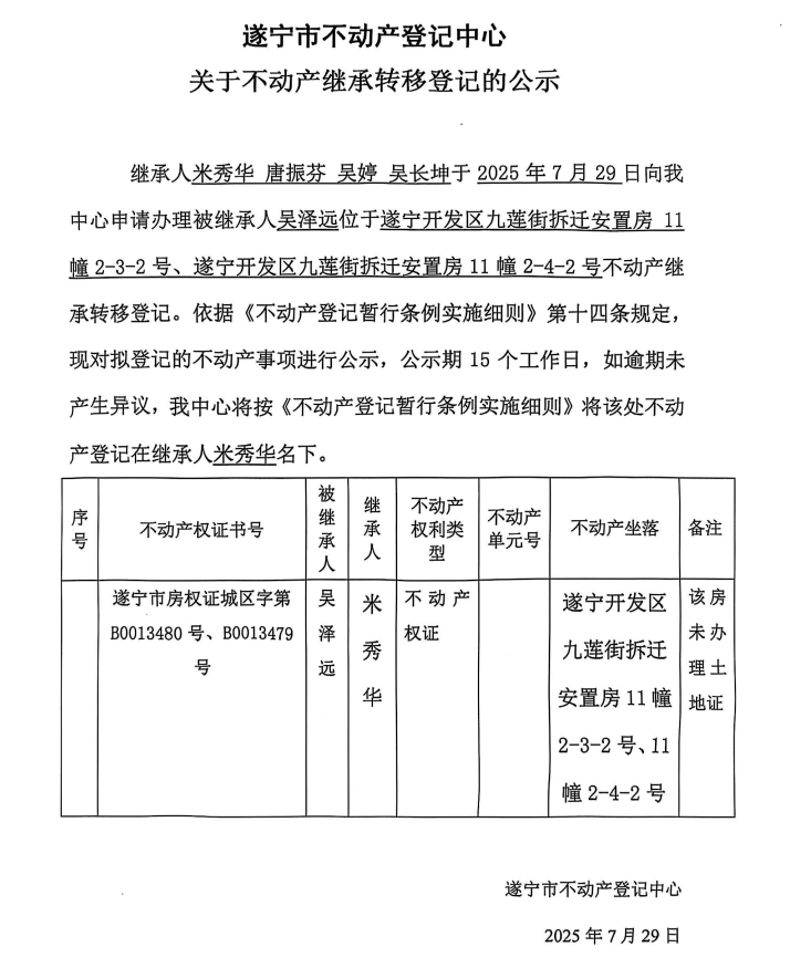 遂宁市不动产登记中心关于不动产继承转移登记的公示(米秀华)