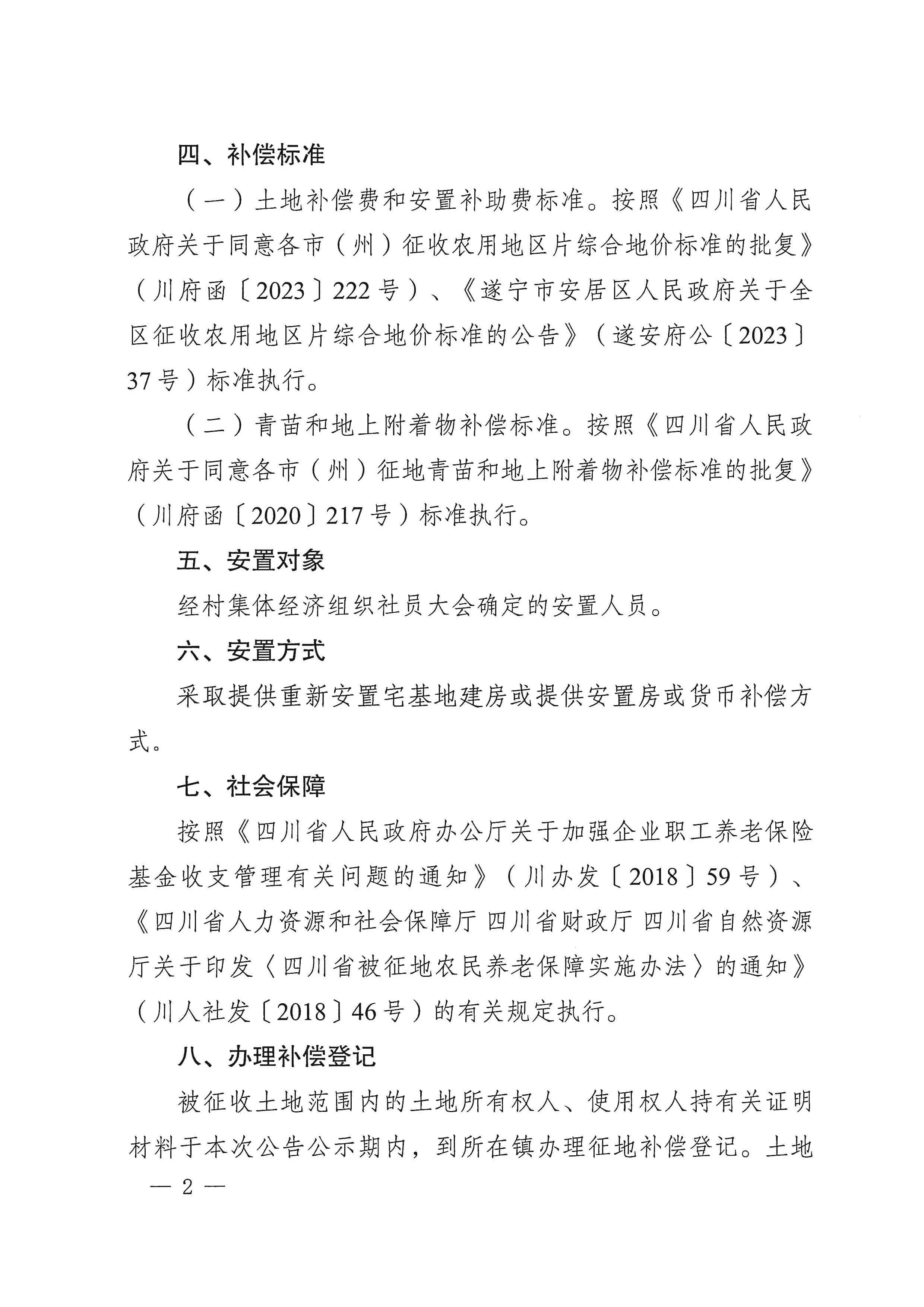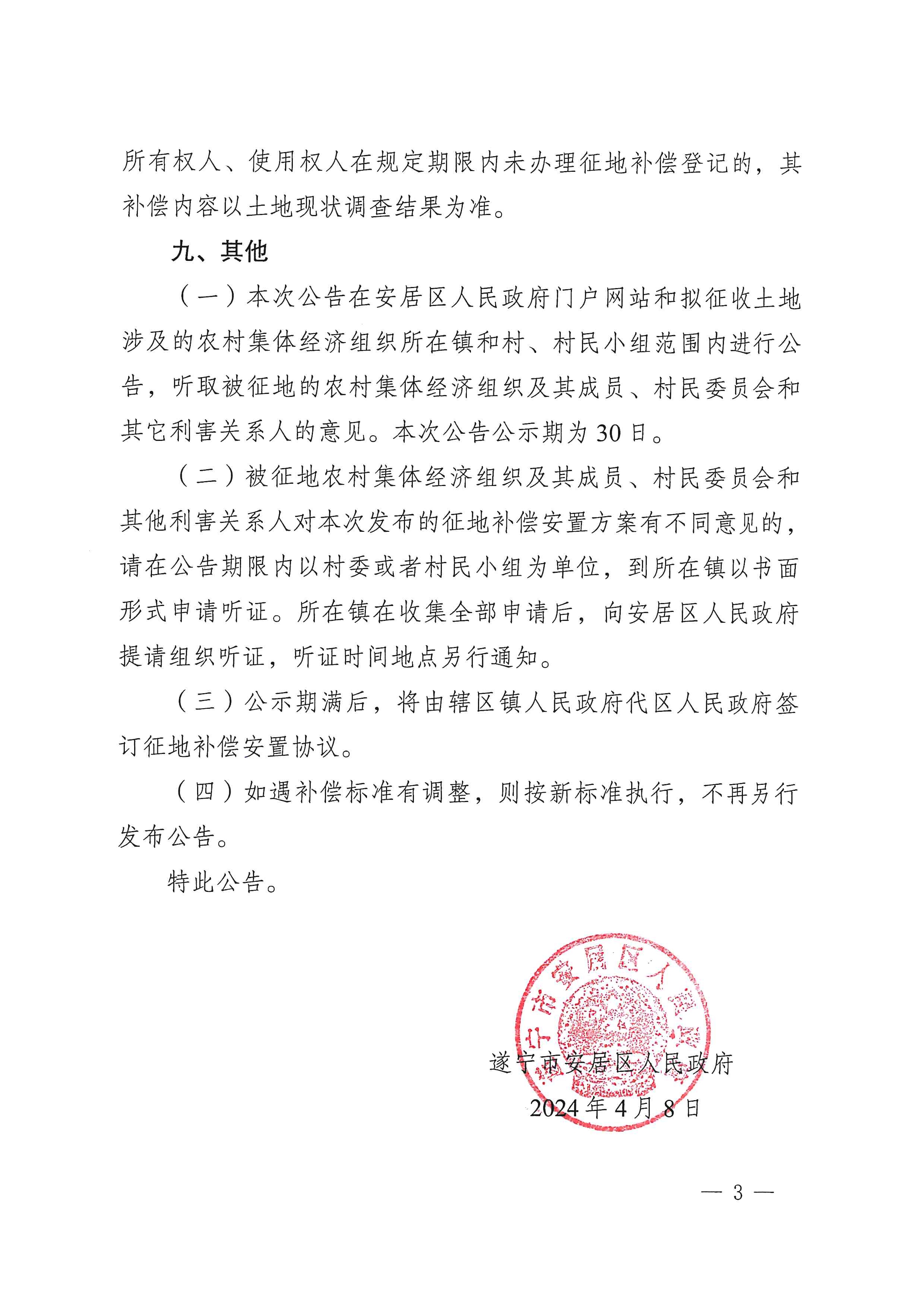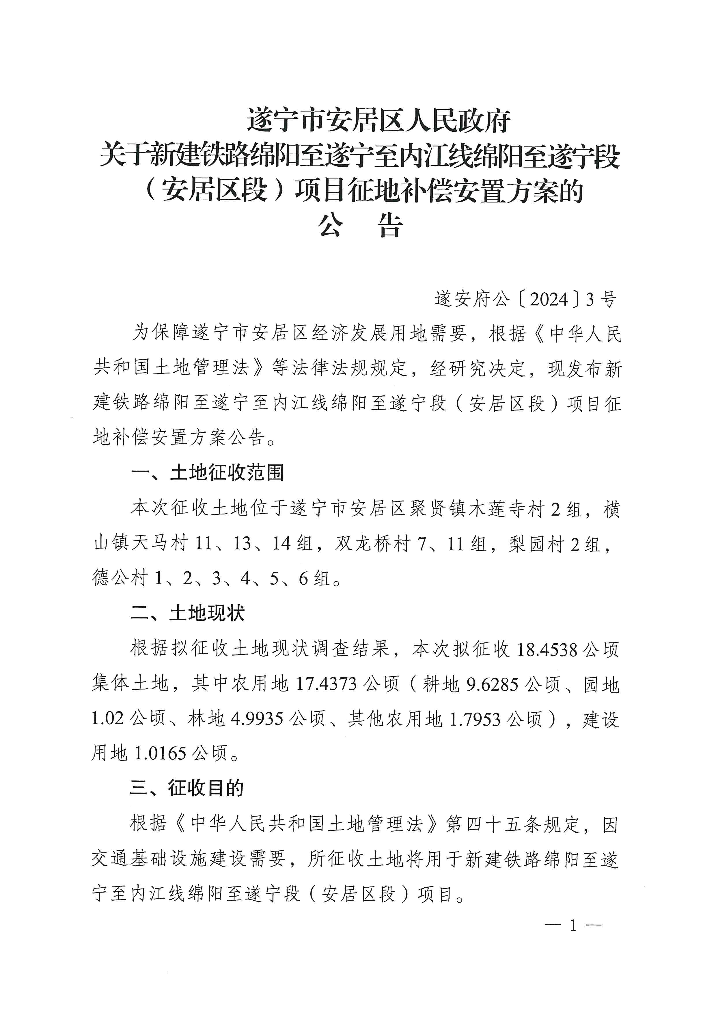 遂宁市安居区人民政府关于新建铁路绵阳至遂宁至内江线绵阳至遂宁段(安居区段)项目征地补偿安置方案的公告(遂安府公〔2024〕3号)