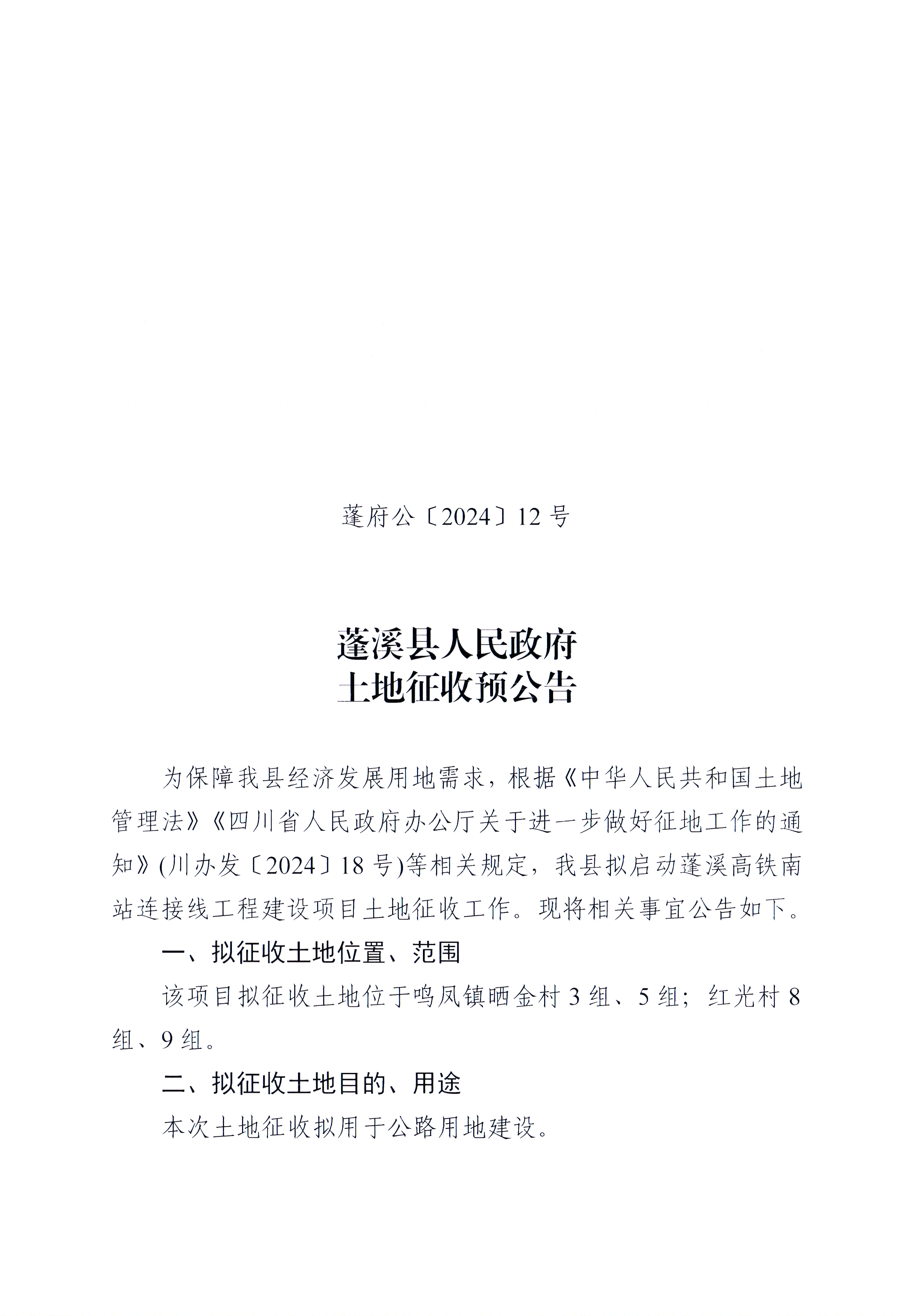 蓬溪县人民政府土地征收预公告(蓬府公〔2024〕12号)