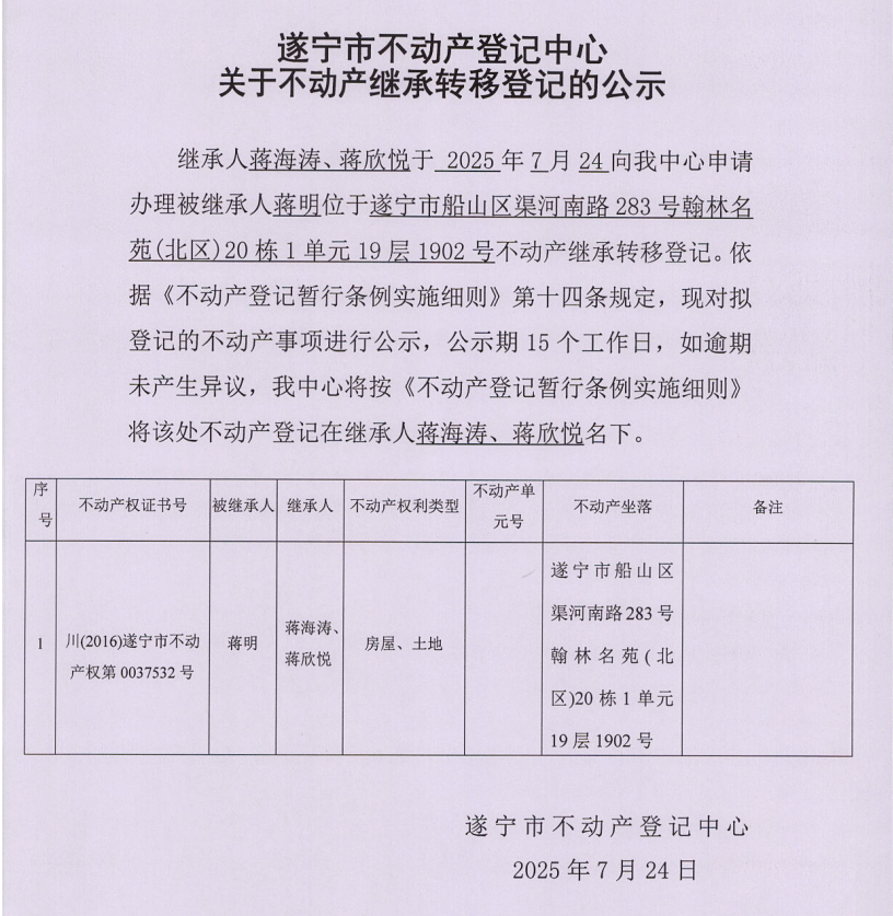 遂宁市不动产登记中心关于不动产继承转移登记的公示(蒋海涛、蒋欣悦)