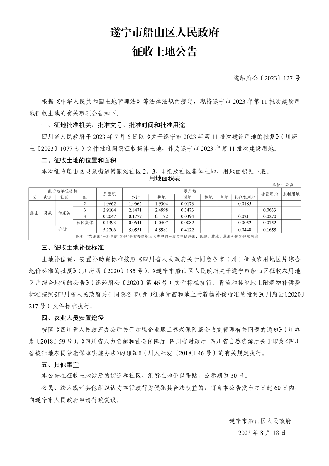遂宁市船山区人民政府征收土地公告(遂船府公〔2023〕127号)