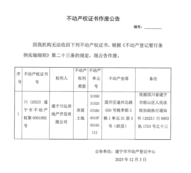 不动产权证书作废公告(遂宁川达房地产开发有限公司)