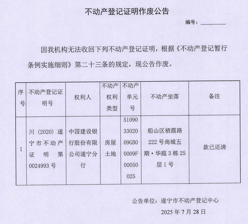 不动产登记证明作废公告(中国建设银行股份有限公司遂宁分行)