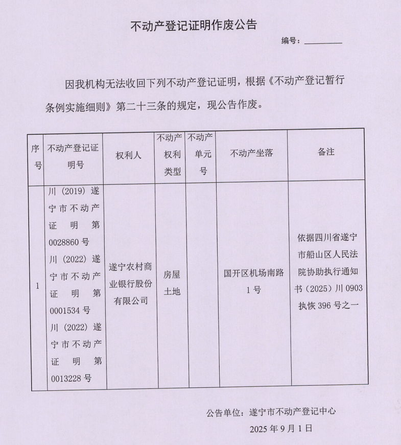不动产登记证明作废公告(遂宁农村商业银行股份有限公司)