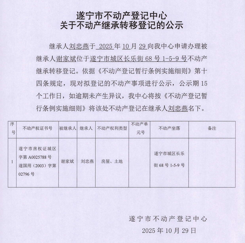 遂宁市不动产登记中心关于不动产继承转移登记的公示(刘忠燕)