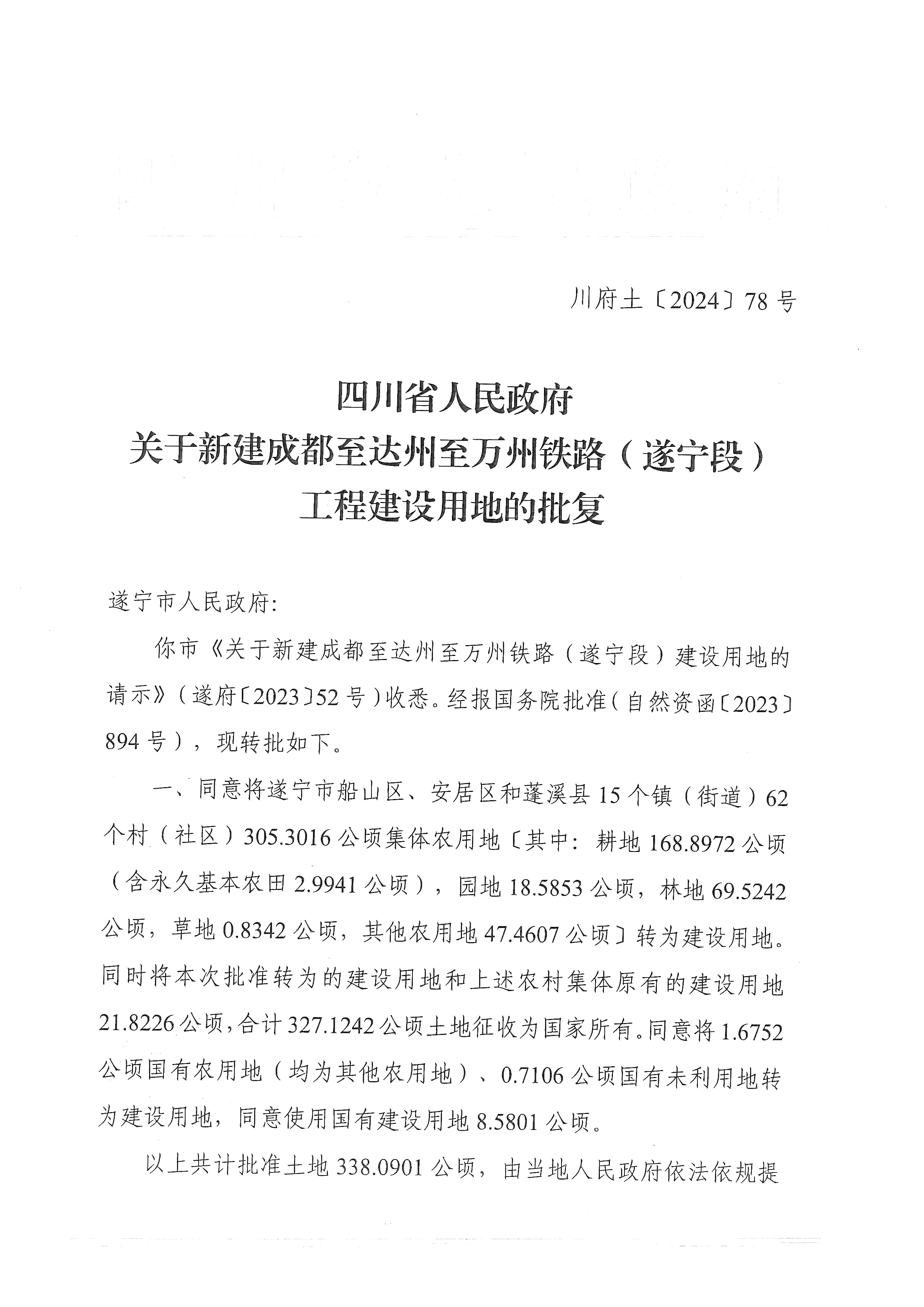 四川省人民政府关于新建成都至达州至万州铁路(遂宁段)工程建设用地的批复(川府土〔2024〕78号)