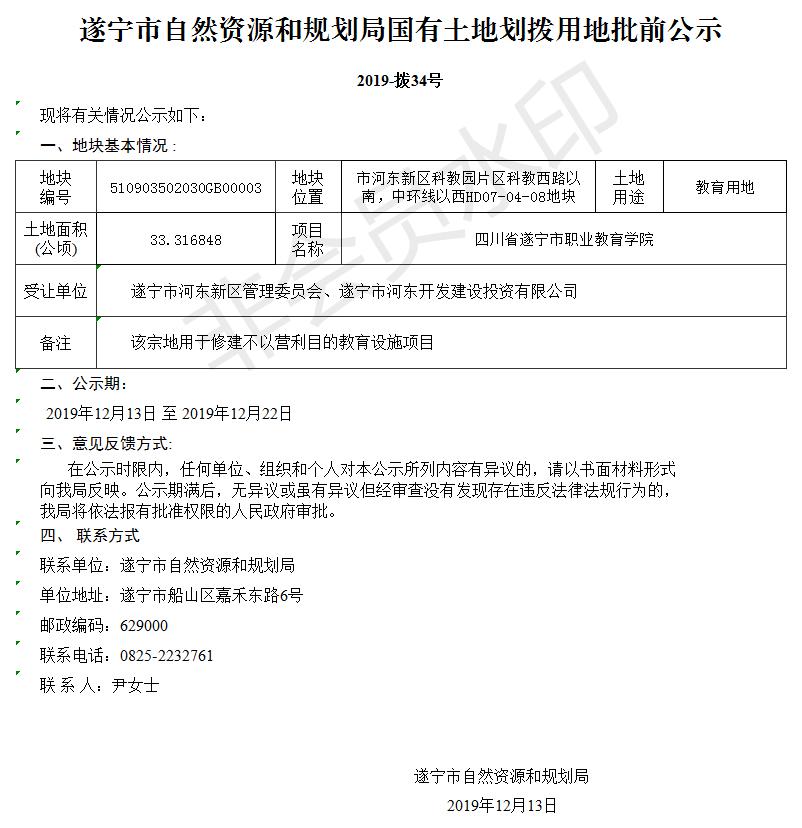 遂宁市自然资源和规划局国有土地划拨用地批前公示(2019-拨34号)