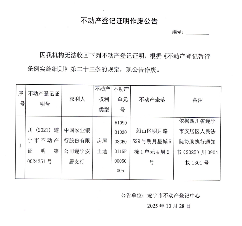 不动产登记证明作废公告(中国农业银行股份有限公司遂宁安居支行)