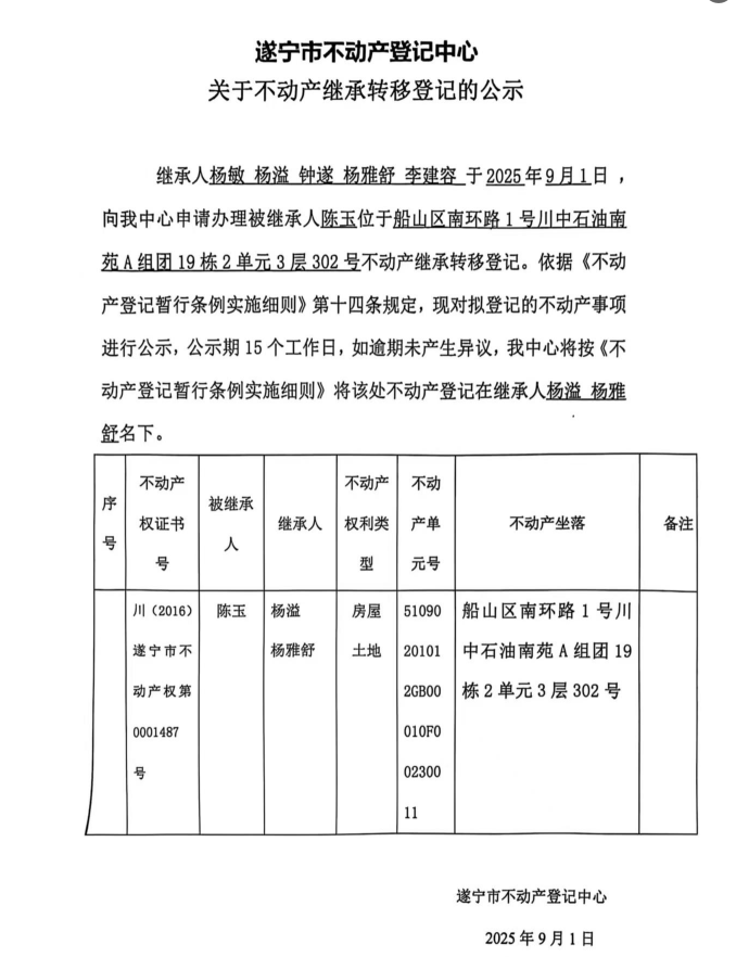 遂宁市不动产登记中心关于不动产继承转移登记的公示(杨溢、杨雅舒)