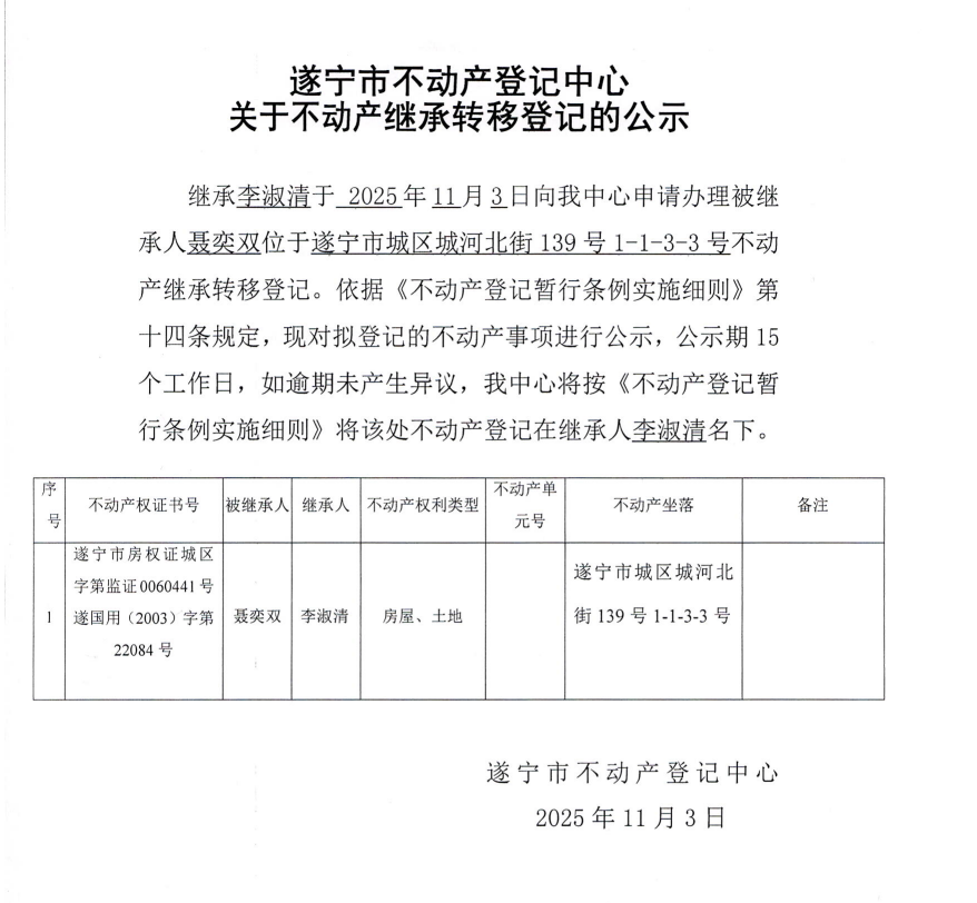 遂宁市不动产登记中心关于不动产继承转移登记的公示(李淑清)