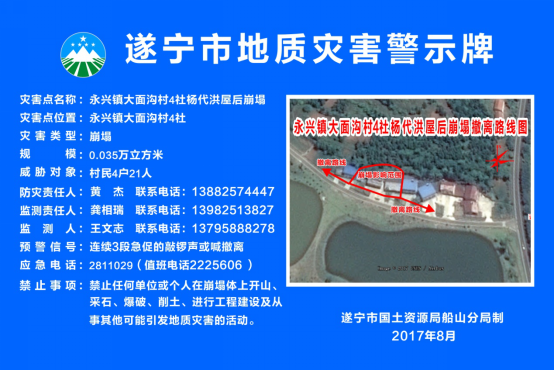 为进一步抓好地质灾害防范工作, 提高广大群众应对和处置突发地灾的能力 。今年6月,市局印发了《关于完善地质灾害警示牌标识设置和管理的紧急通知》(遂国土资发〔2017〕32号), 对全市地质灾害隐患点警示牌完善设置和管理工作 做了详细安排。截止8月底,全市各地按要求已基本完成辖区内 地质灾害隐患点 警示牌的设置、补设、更换工作。特别是船山分局更换了44个原有 地质灾害隐患点 警示牌, 设置新发现地质灾害隐患点警示牌 17个,做到了 地质灾害隐患点 警示牌全覆盖。同时,所有的 地质灾害隐患点 警示牌摒弃了传统手工绘制撤离路线图,直接采用遥感影像图,以撤离路线最佳、时间最短为原则,科学合理制定撤离路线,并用红线标示撤离方向和影响范围,使 地质灾害隐患点 警示牌既直观又醒目,很好的提醒了地质灾害隐患点附近村民及过往行人和车辆。