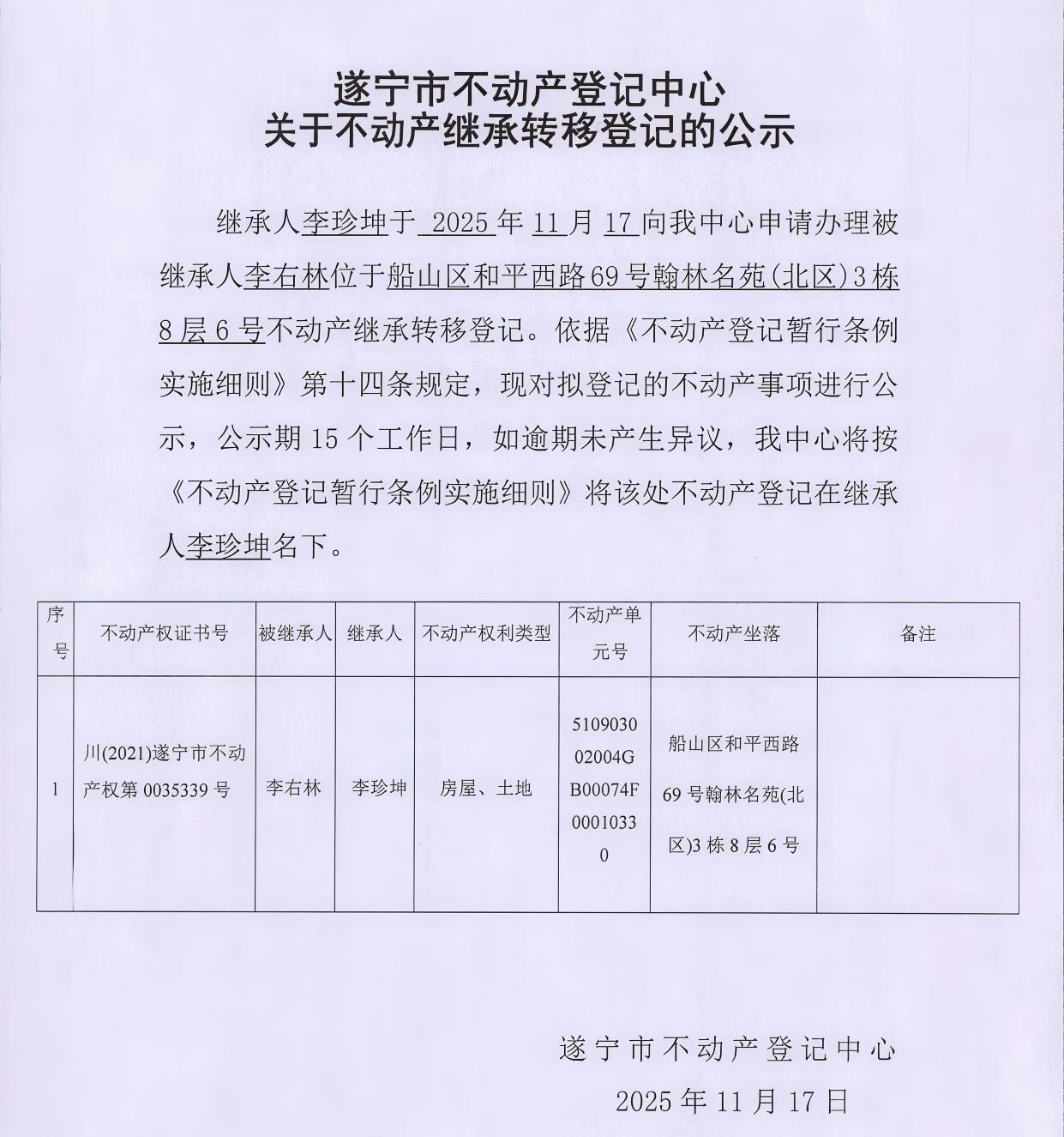 遂宁市不动产登记中心关于不动产继承转移登记的公示(李珍坤)