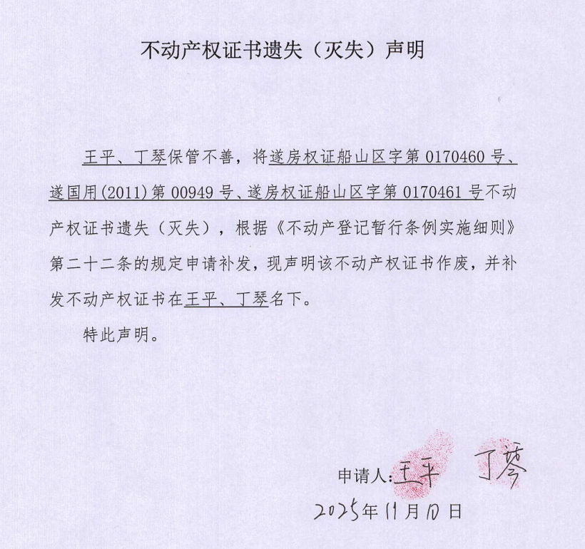 不动产权证书遗失(灭失)声明(王平、丁琴)