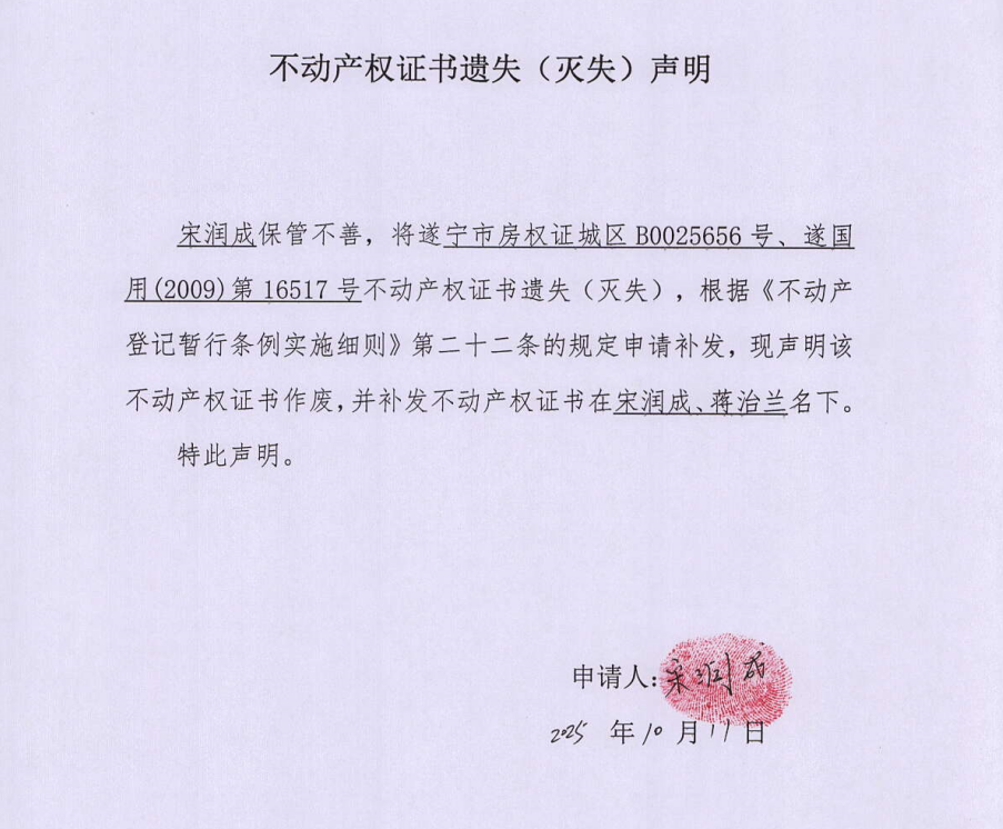 不动产权证书遗失(灭失)声明(宋润成、蒋治兰)