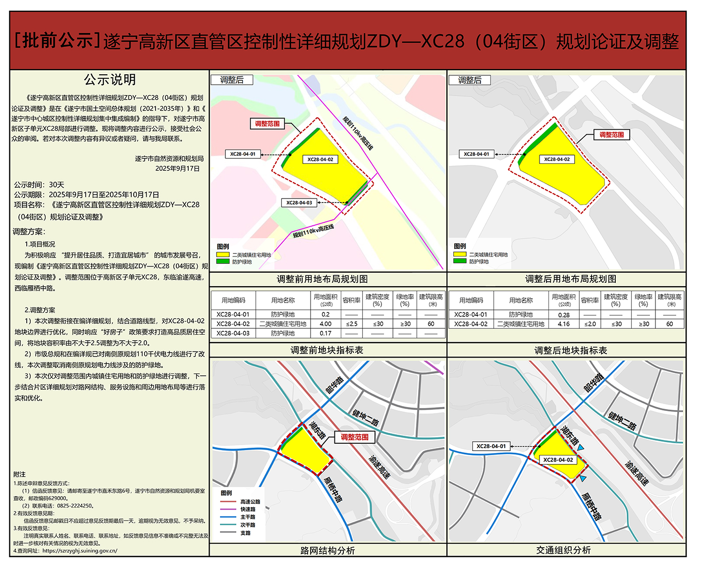 《遂宁高新区直管区控制性详细规划ZDY—XC28(04街区)规划论证及调整》是在《遂宁市国土空间总体规划(2021-2035年)》和《遂宁市中心城区控制性详细规划集中集成编制》的指导下,对遂宁市高新区子单元XC28局部进行调整。现将调整内容进行公示,接受社会公众的审阅。若对本次调整内容有异议或者疑问,请与我局联系。