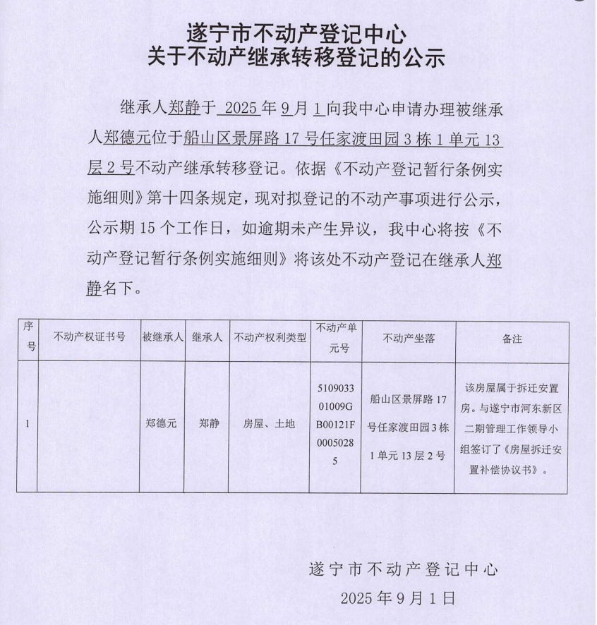 遂宁市不动产登记中心关于不动产继承转移登记的公示(郑静)