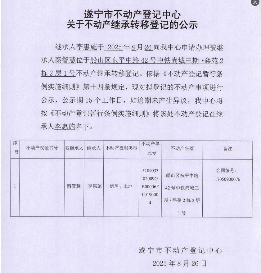 遂宁市不动产登记中心关于不动产继承转移登记的公示(李惠施)
