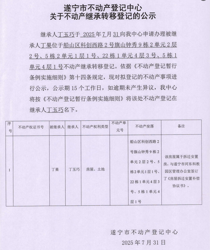 遂宁市不动产登记中心关于不动产继承转移登记的公示(丁玉巧)