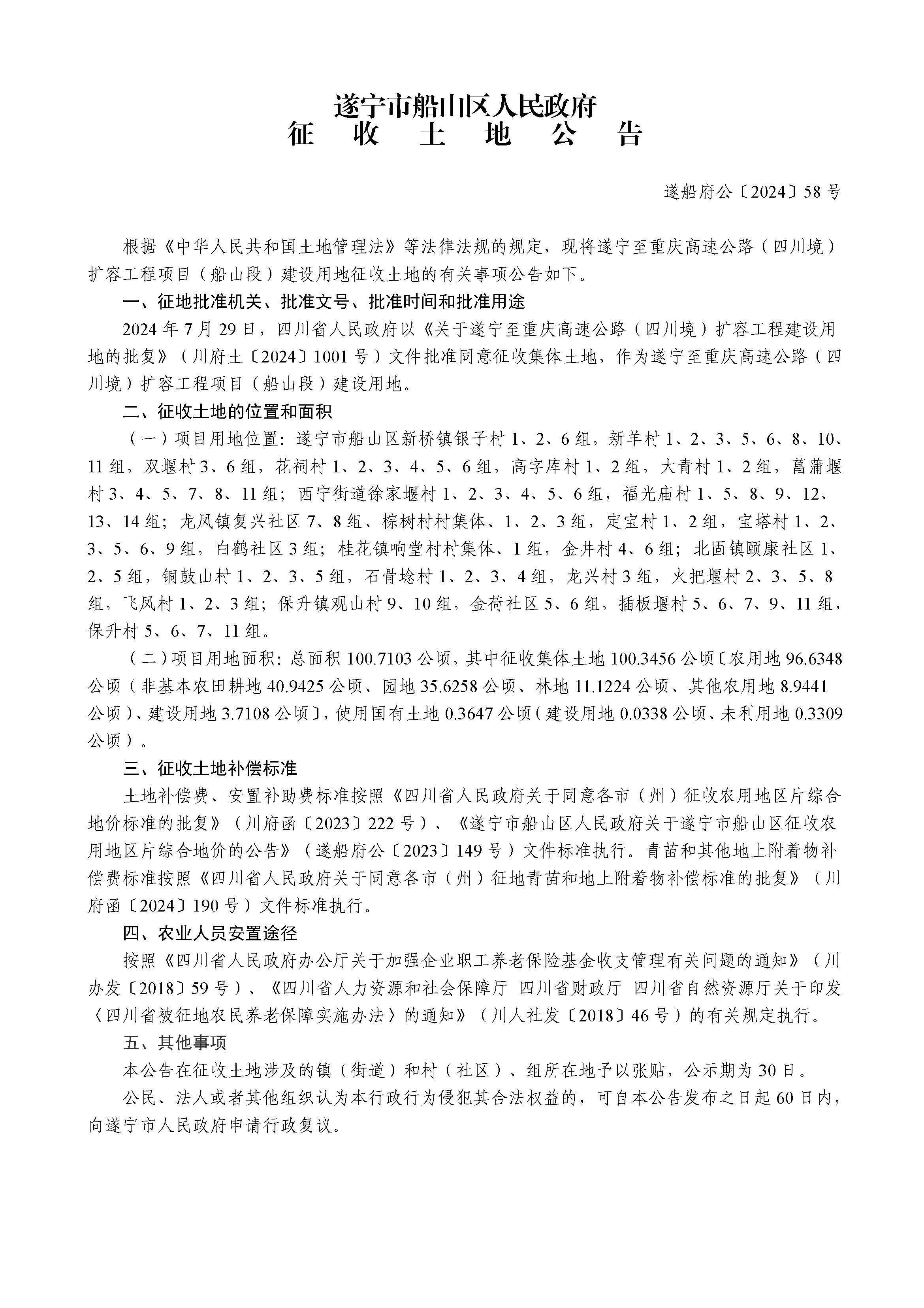 遂宁市船山区人民政府征收土地公告(遂船府公〔2024〕58号)